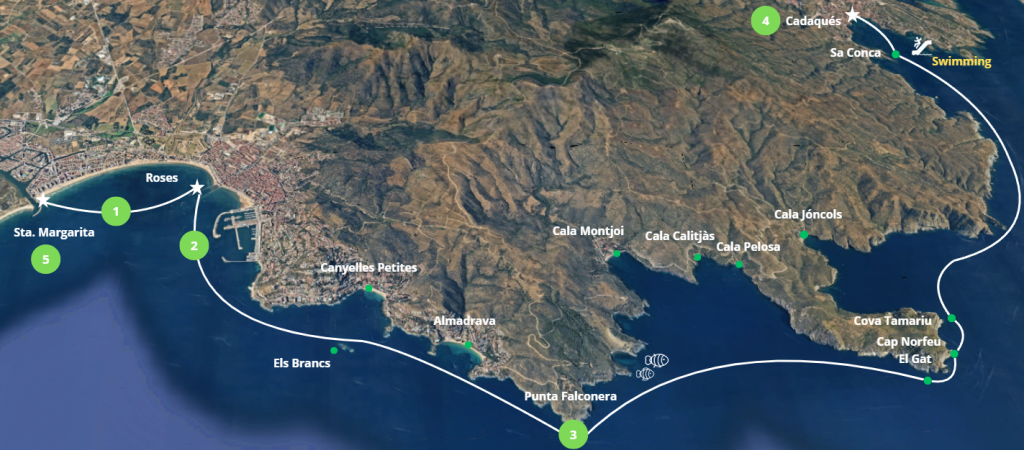Durante el trayecto de ida, de aproximadamente 45 minutos, disfrutarás de paisajes únicos del Cap de Creus, acantilados, calas escondidas y aguas cristalinas. Pasaremos por puntos de gran interés natural como: