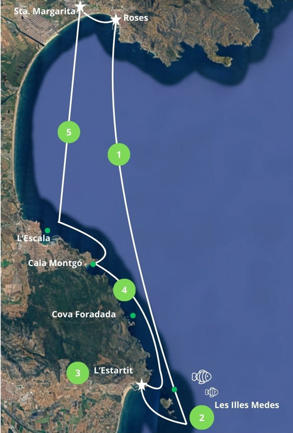 En el trayecto de vuelta, navegaremos frente a L’Escala y nos adentraremos en el golfo de Roses, disfrutando de vistas al histórico puerto griego de Sant Martí d’Empúries, Sant Pere Pescador, las playas de Empuriabrava y La Rubina, hasta llegar a Santa Margarita y regresar a Roses.
